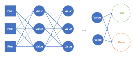 Figure 1 shows how the machine starts at pixels of the image and feeds them through a network-like structure (like, a neural network? Hint-Hint). We start at the image's pixel values and have layer after layer of intermediate nodes. Then, in the end, we have the two output nodes, which represent the two numbers "is a bird" and "is a plane." The connections between the nodes say, "Take the value of the current node, multiply it by a factor, and pass it along."